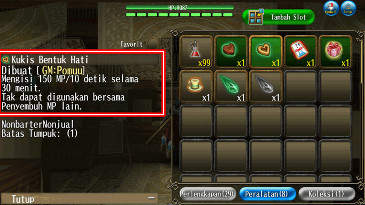 - Peneraan nama pembuat dan naiknya efek pemulih MP hanya akan berlaku bila "Kukis Bentuk Hati" dibarter dengan pemain lain. Efek dan keterangan "Kukis Bentuk Hati" tidak akan mengalami perubahan bila dikirim sebagai bingkisan atau dijual via Market.